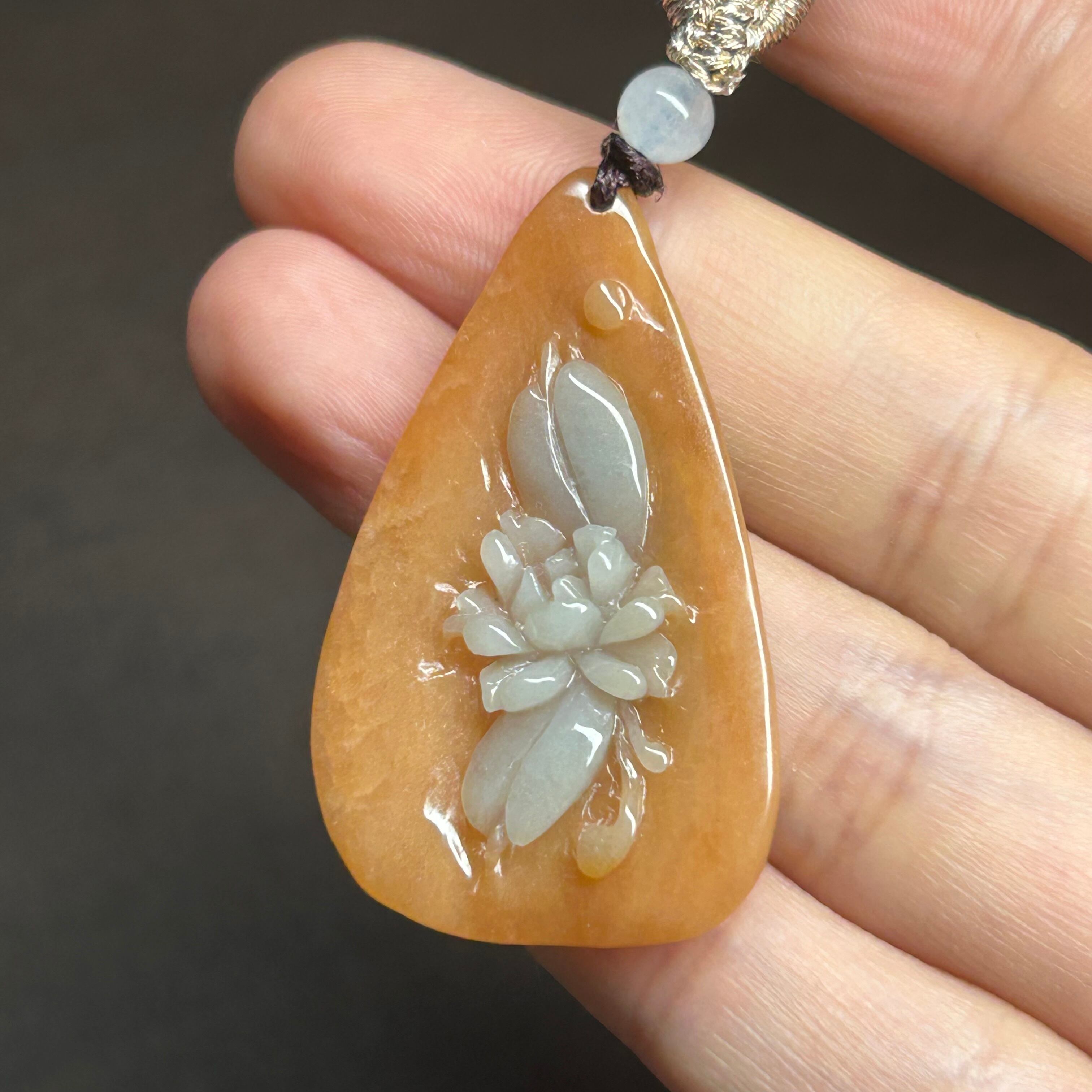 本翡翠ペンダントは、希少なオレンジレッドの色合いを持つミャンマー産翡翠を使用し、蓮の花をモチーフにした立体彫刻が施されています。