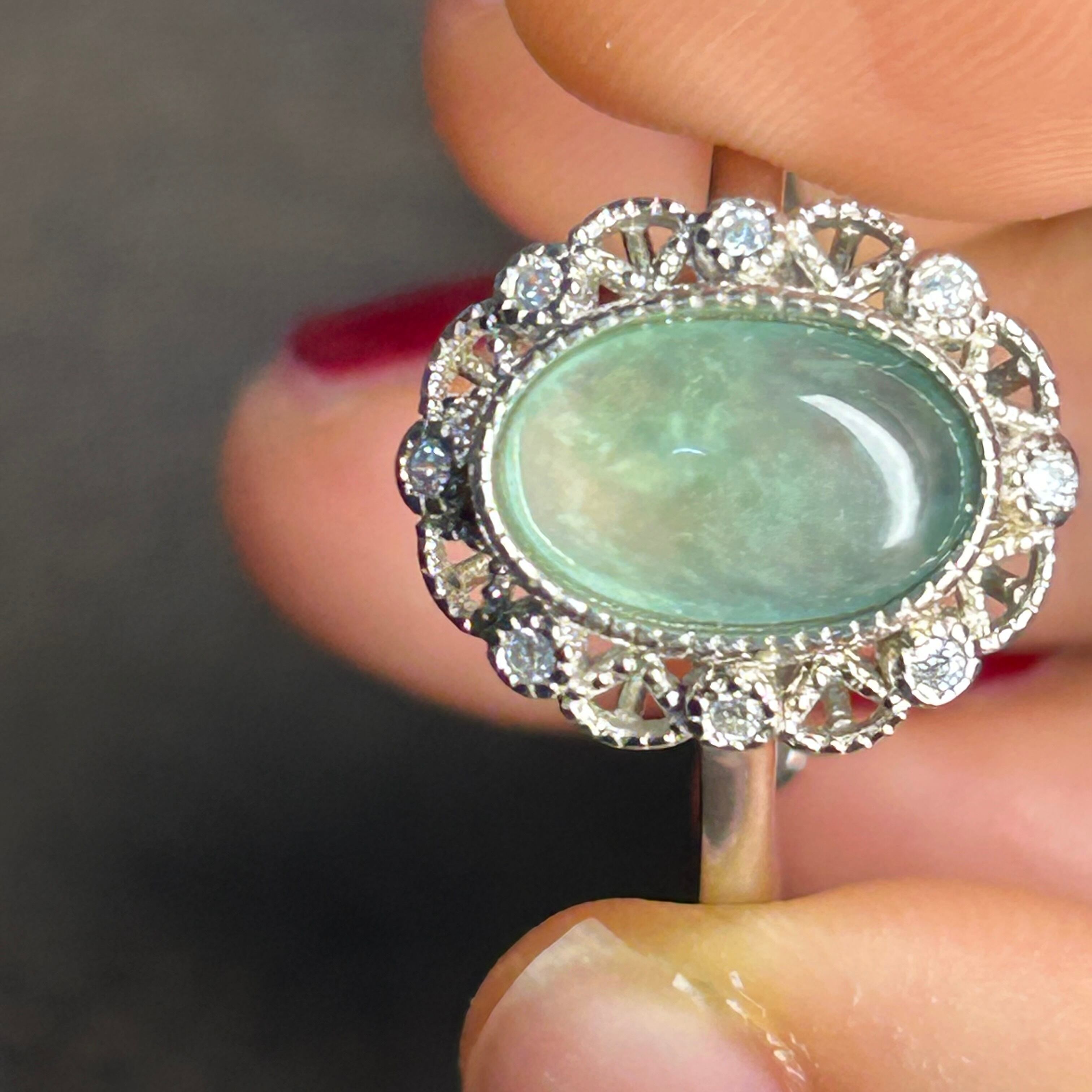 ●翡翠は光線によって、違いが出やすい宝石ですので、違う光線の下で見た感じが少し違います。あらかじめご了承ください。