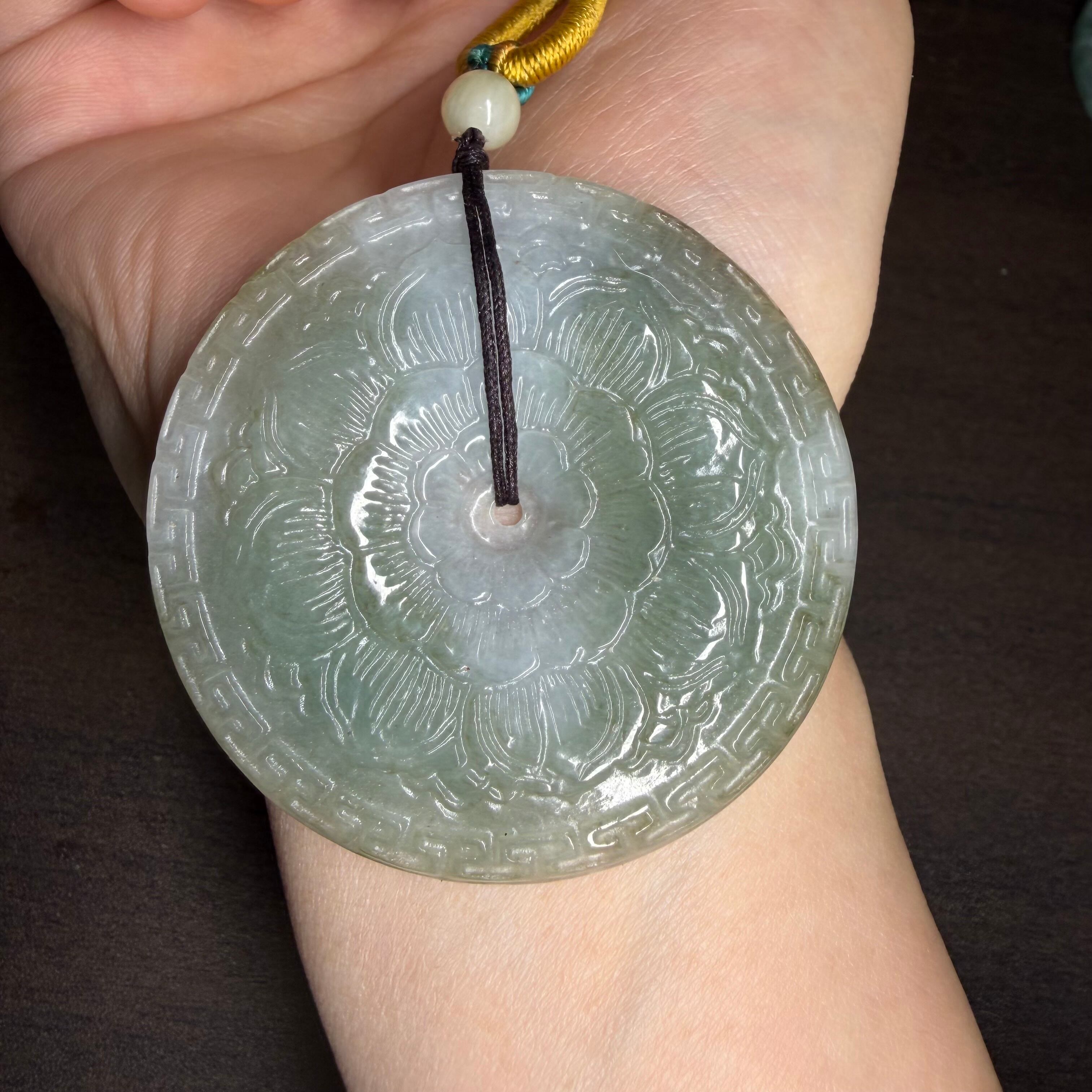 本翡翠ペンダント 牡丹模様 希少色 繊細な堀刻 ミャンマー産 無含浸 無着色
