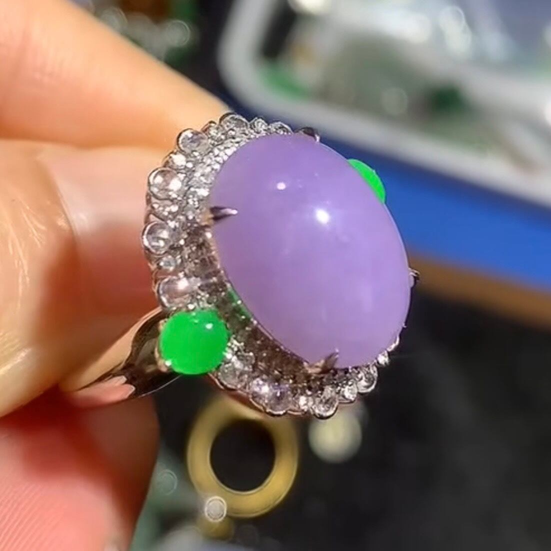 ●翡翠は光線によって、違いが出やすい宝石ですので、違う光線の下で見た感じが少し違います。あらかじめご了承ください。