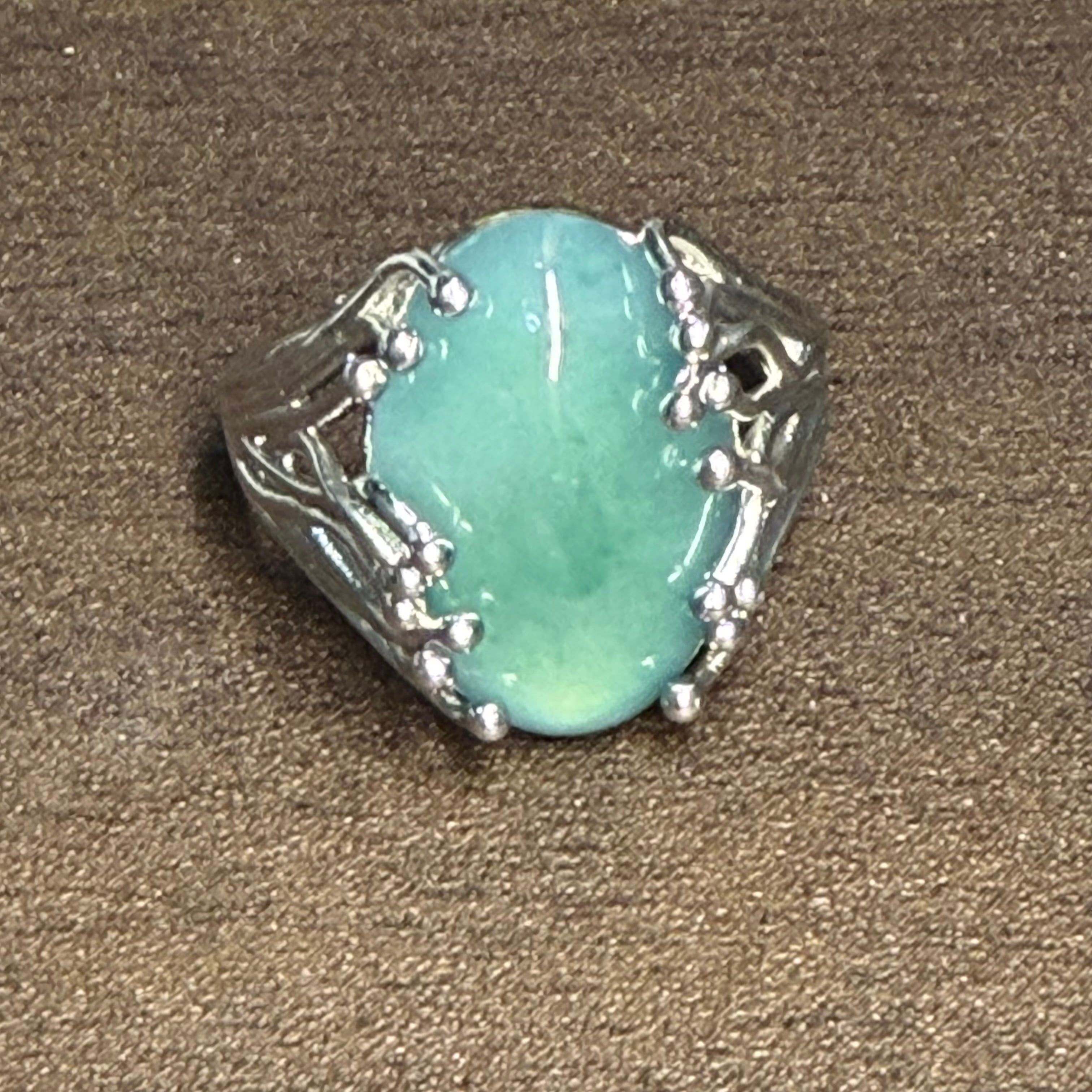 主石には、ふっくらとしたオーバル型の翡翠カボションを使用。やわらかなブルーグリーンの色合いが印象的で、まるで静かな湖面のように落ち着きと奥行きを感じさせます。光に当たると、しっとりとした艶と透明感が現れ、きめ細やかな質感が際立ちます。